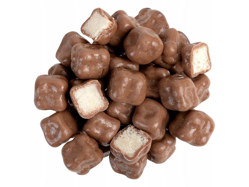 Složení: Kokosová kostka (50%) (kokosová mouka,maltodextrin, glukózový sirup, fruktóza), čokoláda (49 %) [cukr),kakaový tuk, sušené mléko,syrovátka v prášku,kakaová hmota, emulgátor:sójový lecitin, vanilkové aroma], glazurující směs (1%) [glukózový sirup,emulgátor (žvýkačka),šelak), rostlinný olej (kokosový, řepkový), modifikovaný tapiokový škrob). Obsah kakaové sušiny nejméně 31 %.